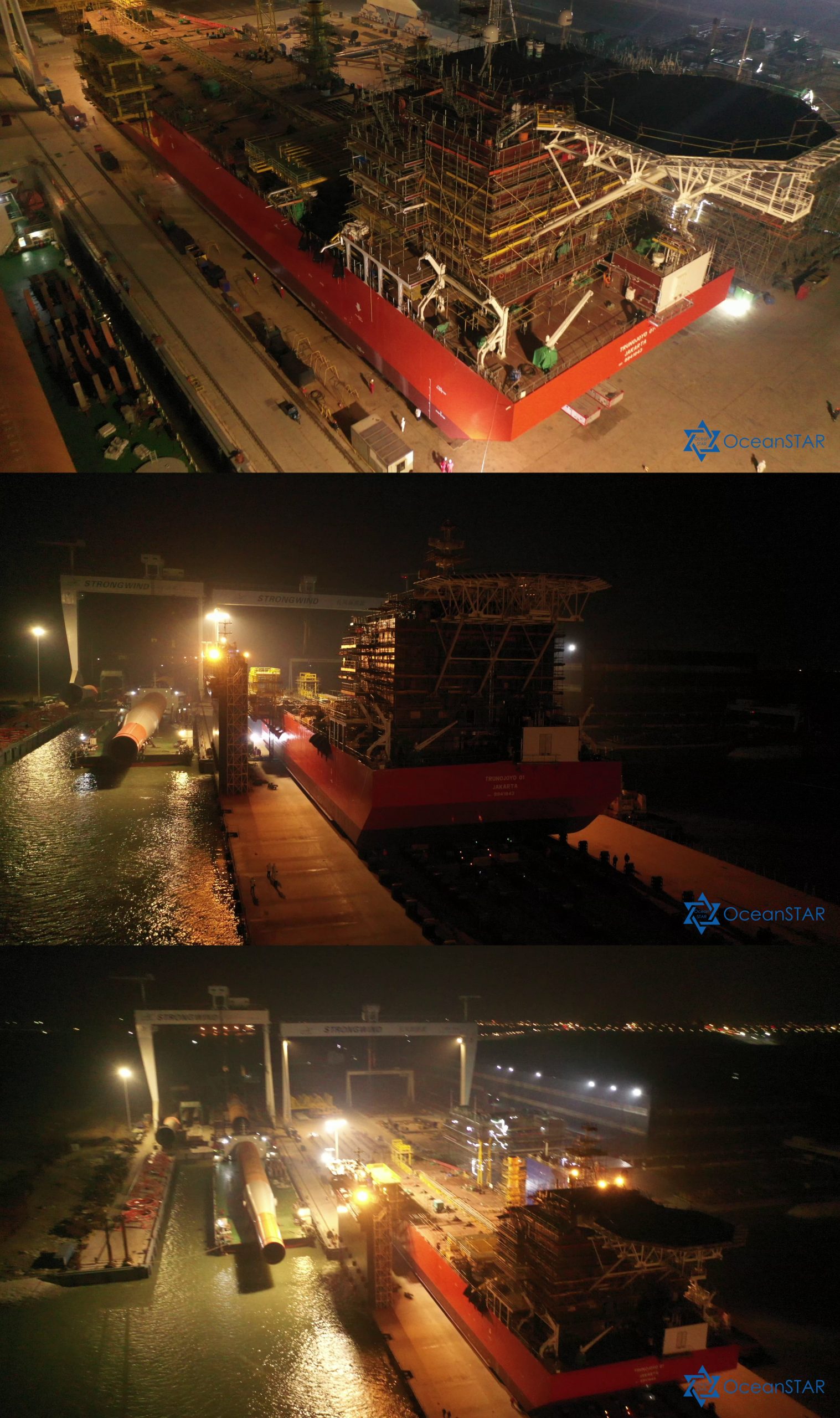 26 Jan 2022 – FPU TRUNOJOYO 01 was successfully launched at Jiangsu Strongwind Tongzhou Bay Shipyard during 18 January 2022 to 22 January 2022. The FPU was first jacked up and skidded over the launch barge. The launch barge was towed out and submerged, allowing the FPU to float out, and tow back to the Shipyard. The operation was carried out successfully, safety and on schedule.