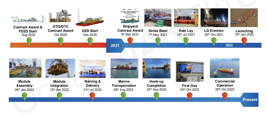 | HCML | FPU Trunojoyo 01 | Full EPCIC Scope The new build FPU with main dimension of 160m LOA, 32m Breadth and 11m Depth will have main facility comprising: Process facility including separation, gas compression, gas dehydration and custody transfer metering system; Utility System including fuel gas system, open-drain and closed-drain, flaring system, lifting cranes, instrument & utility air, seawater, fresh water, potable water, firewater, power generation and electrical system, E-house, control system, telecommunication system, etc; Living Quarter (Accommodation) with capacity of 70 POB for the FPU CONTRACTOR’s operations personnel, including COMPANY’s personnel and occasional short-term stay for offshore maintenance staff; Helideck; Lifesaving & fire-fighting system; Marine system; Spread mooring with 12 studless chain lines and driven anchor pile type supported by chain stoppers; Bunkering/de-bunkering facilities for diesel fuel oil and bunkering facilities for fresh water; Flexible jumpers and umbilical (power cable and fiber optic). | Delivered First Gas on Oct 23rd, 2022 Operating safely and continuously to date |